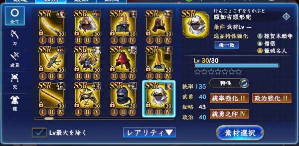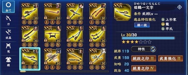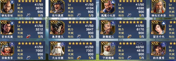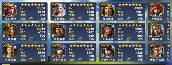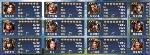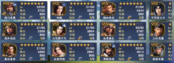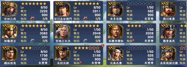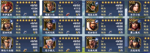 ・S11までの武将は概ね完凸、筆くじ謙信/家康完凸→馬/槍/弓/鉄砲、どの兵科でも5-6部隊組めます