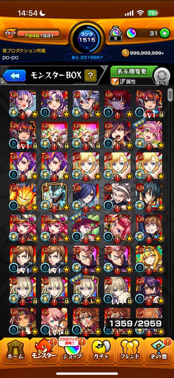 ランク1500⇧ ガチャ限1359 運極900
