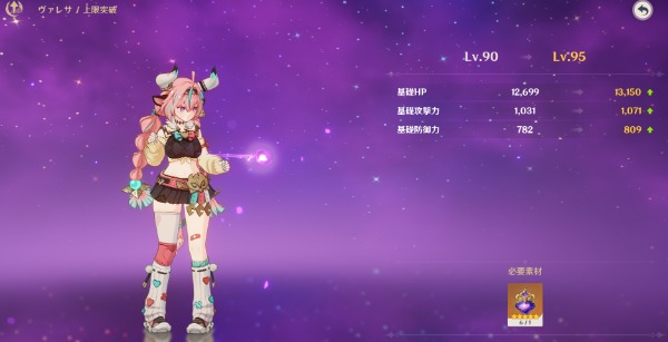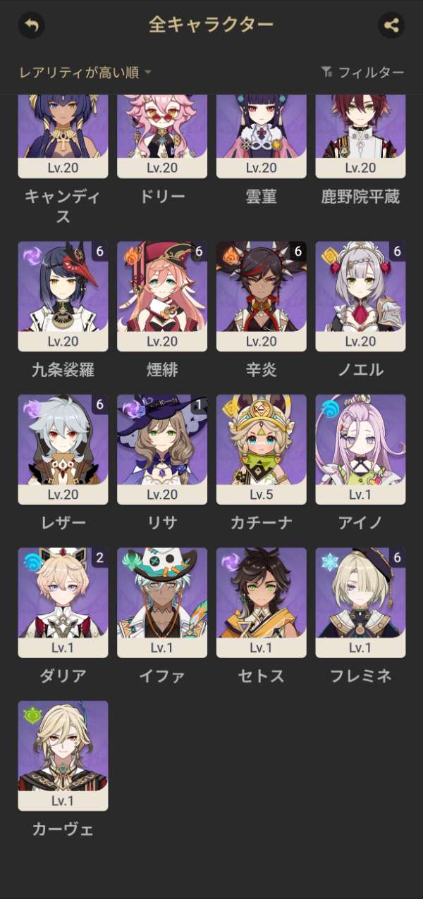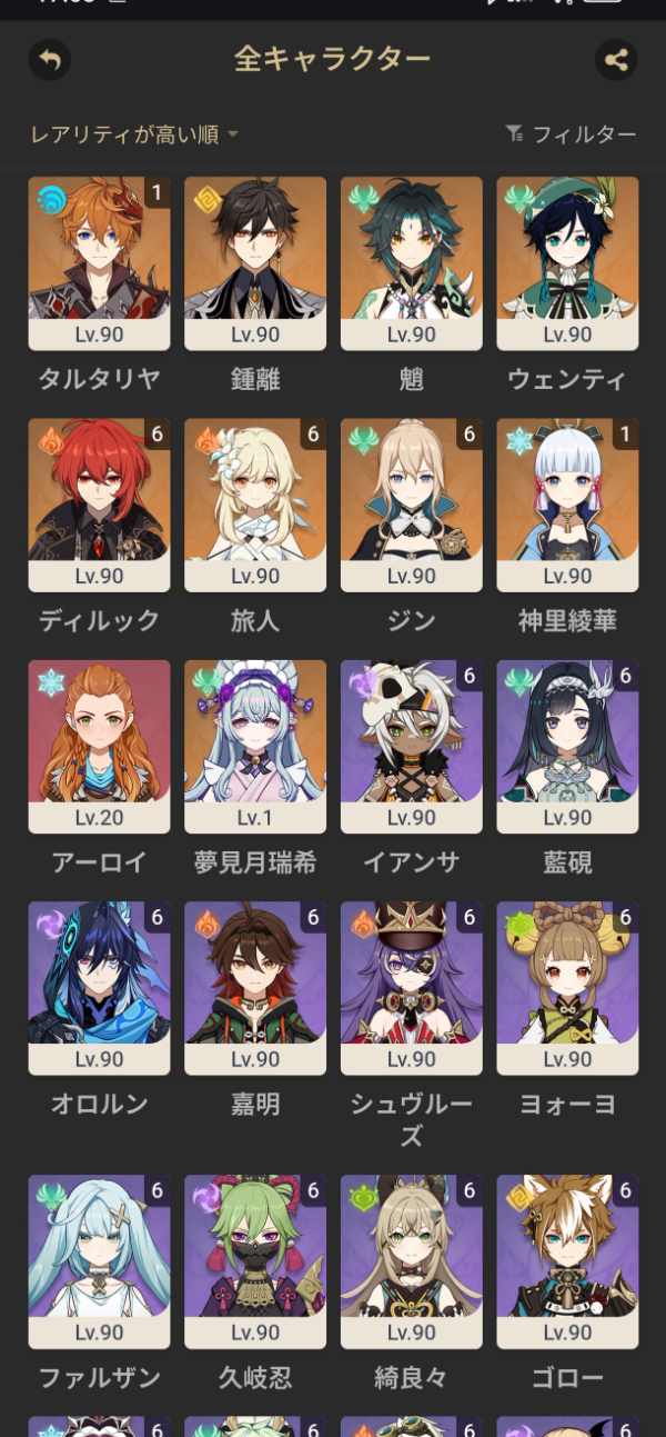星5キャラ スカーク(100Lv)、ヴァレサ、チャスカ、召使、ヌヴィレット、フリーナ、ティナリ、モナ、ディルック、ジン、七七、刻晴 完凸