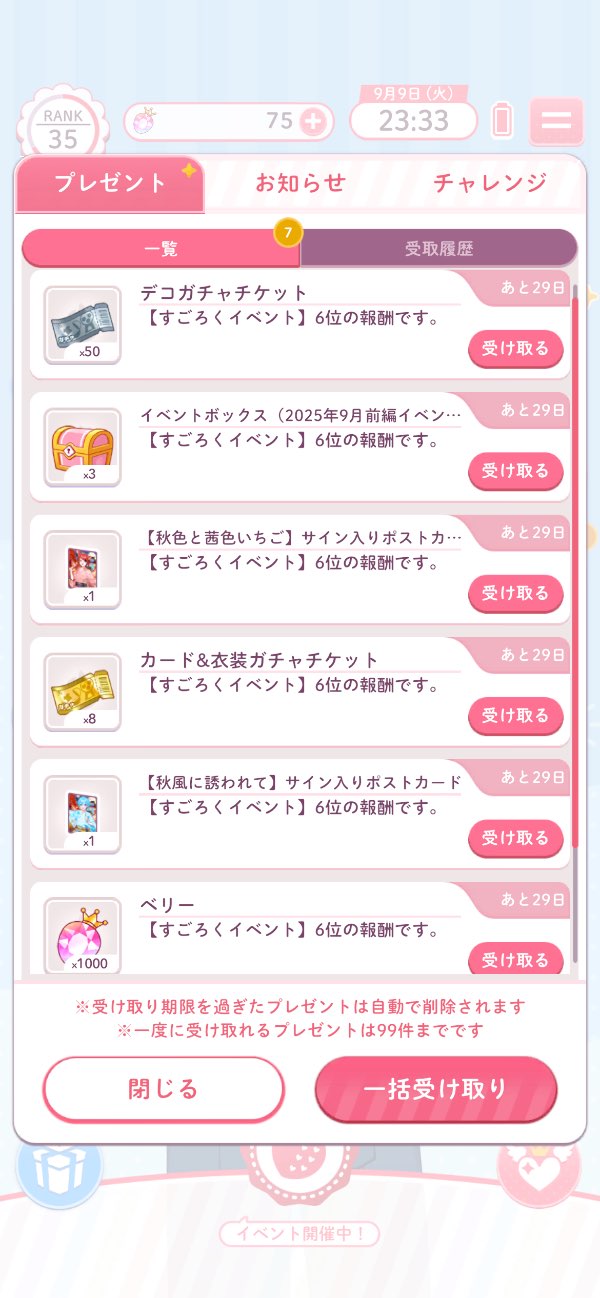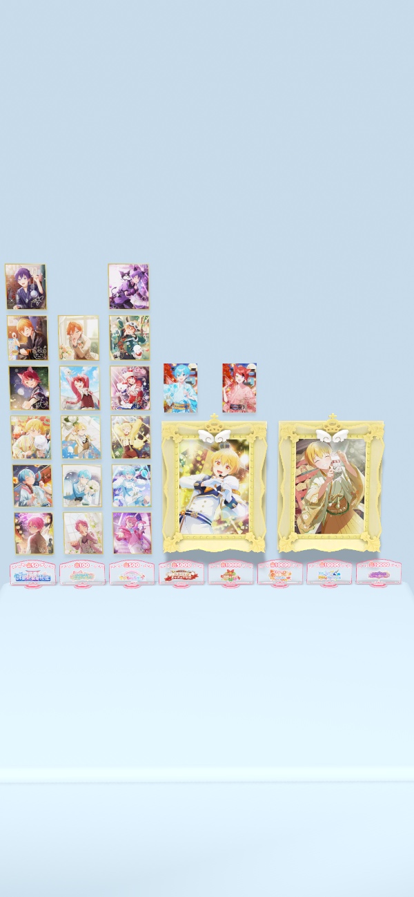 イベランも何回かしており、最近の秋風にゆれる兄妹ごころ前半では6位(画像9枚目参照)、その他TOP50.100.500を経験済みで、イベントランキング上位報酬でもらえるサイン入り色紙やポストカードを所持しております(画像5-7枚目参照)。