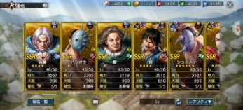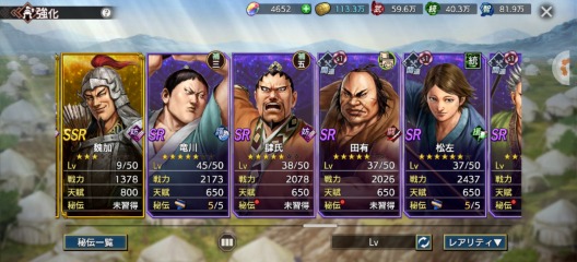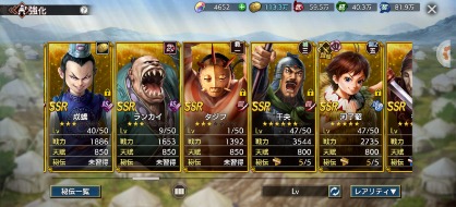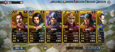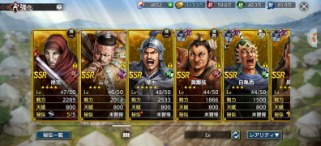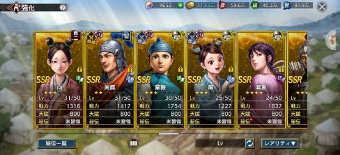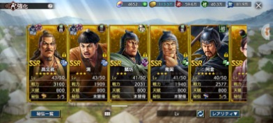 全武将います。SSRのみ写真を載せました、凸は写真を参考にお願いします。天賦800の武将は将星印が勿体ないので友好度はあるけど凸していない武将も結構います。無償覇道石が4600ありますので、取引後改名筆でお好きな名前に変更してください。