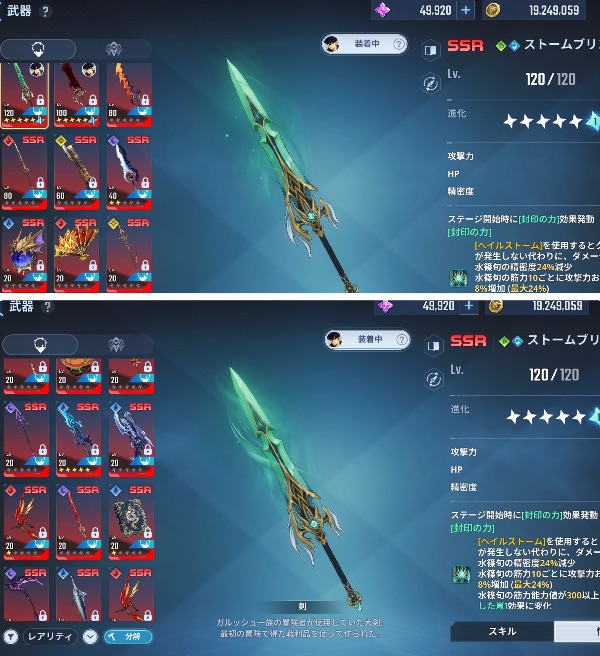 ストームブリンガー6凸 悪魔王の短剣6凸 影の鎌1凸 月影2凸 テティスの魔導書1凸 炎鳥霊1凸