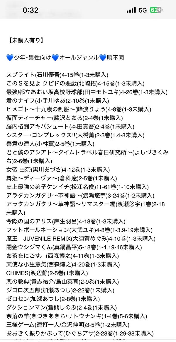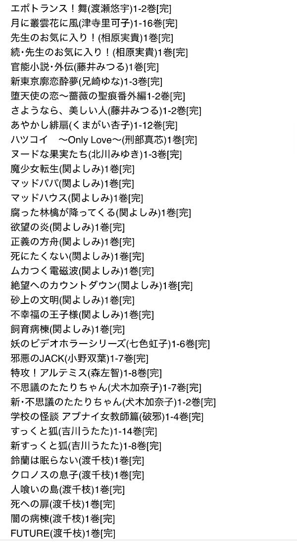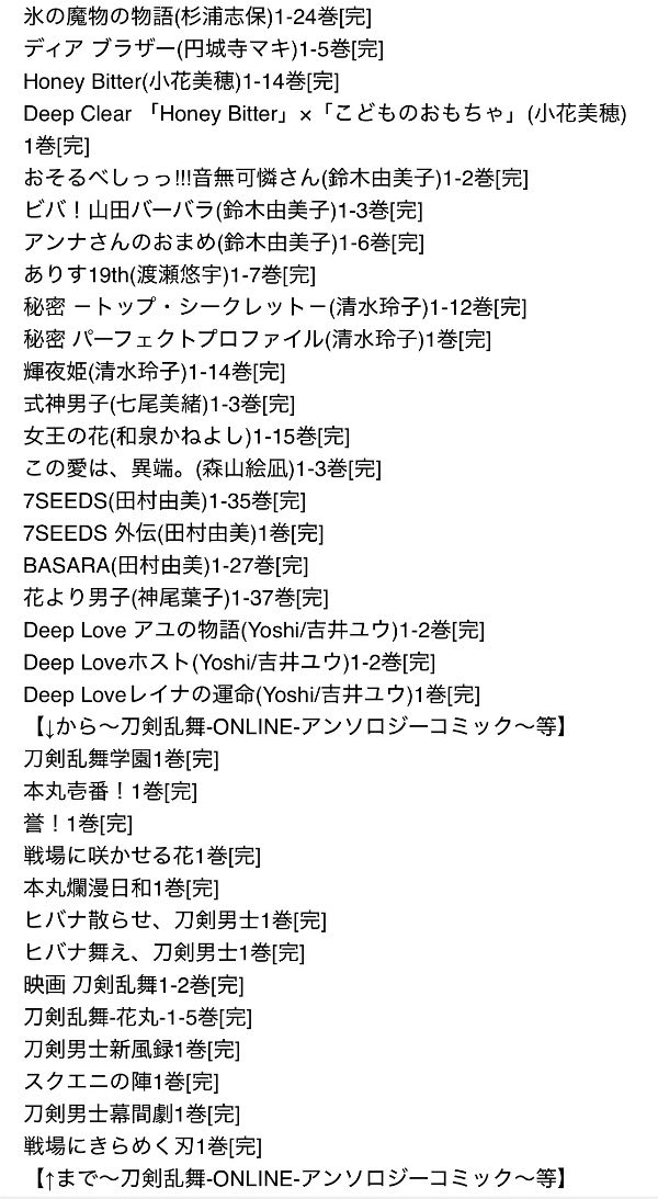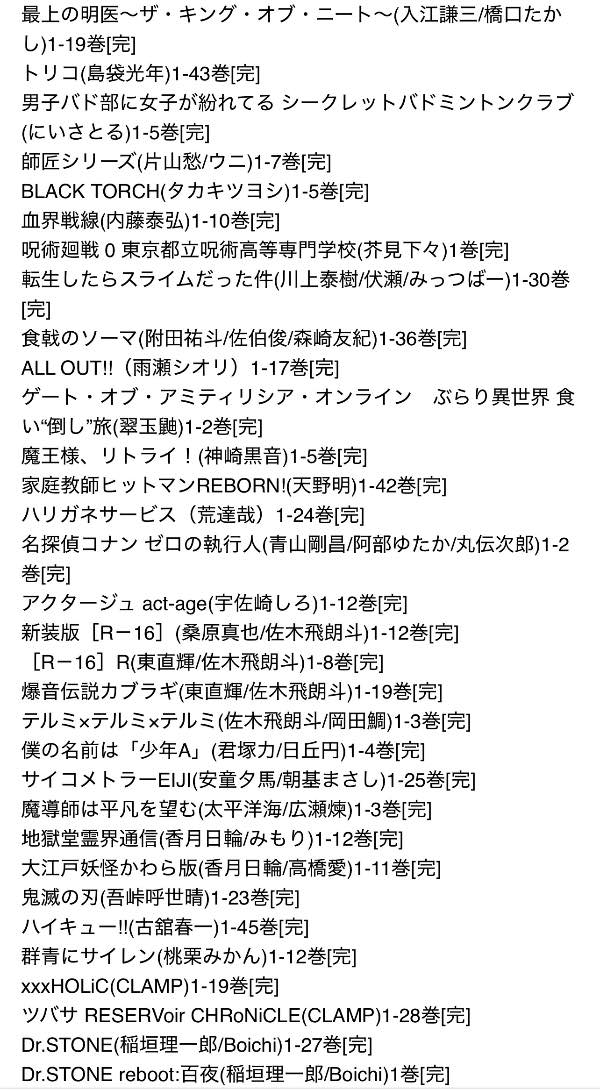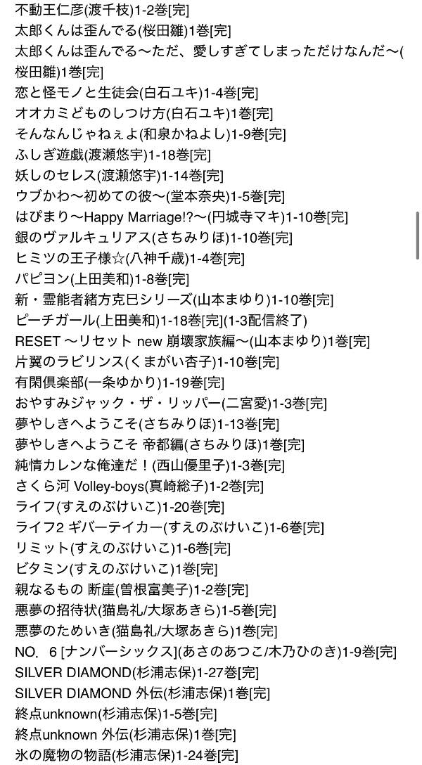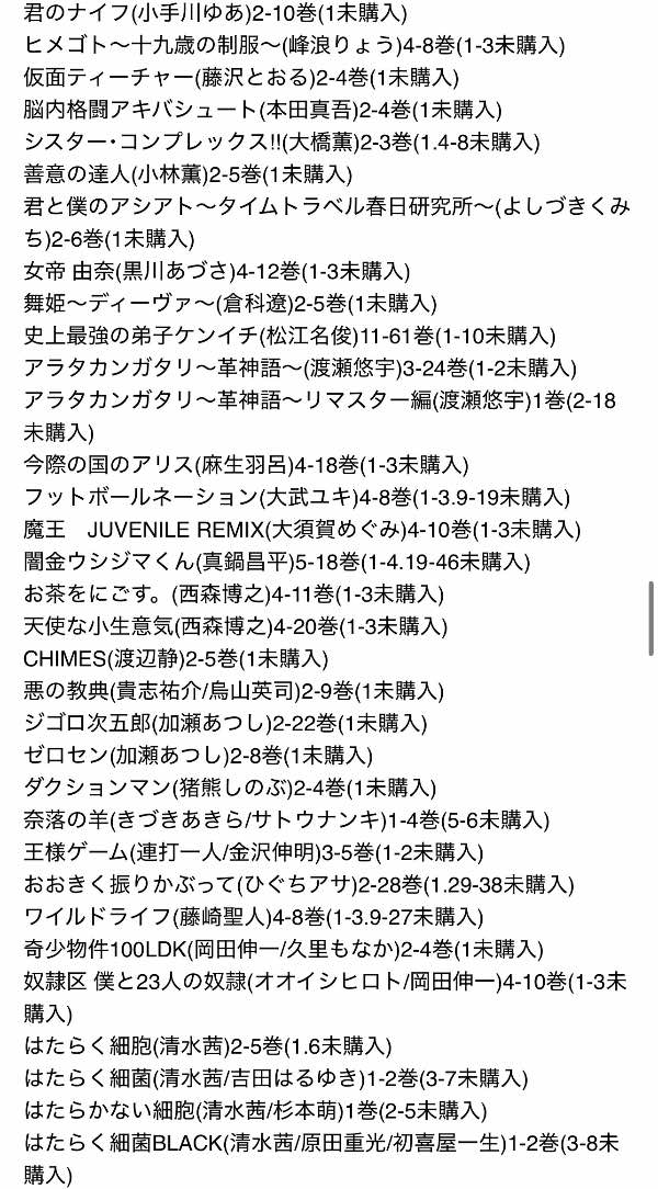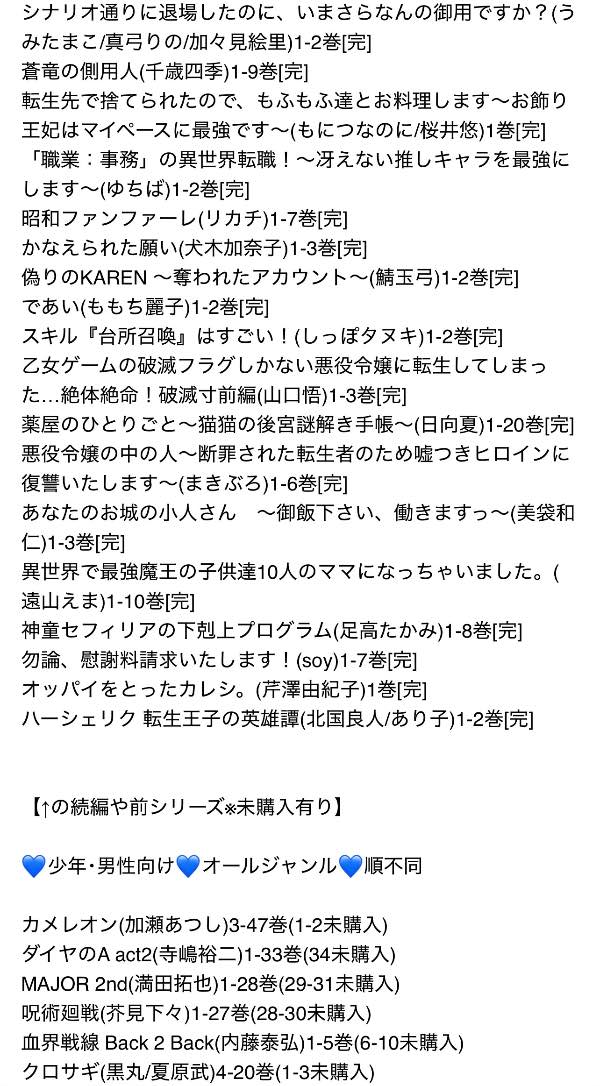 お試し無料購入分、話読み、多い巻数の1巻のみなどは時短のため、また大人漫画は恥ずかしさのためにそこそこあるのですが大体一覧から省いてあります。購入していただいてから、こんなのも入っていたのかと福袋感覚でお楽しみください。
