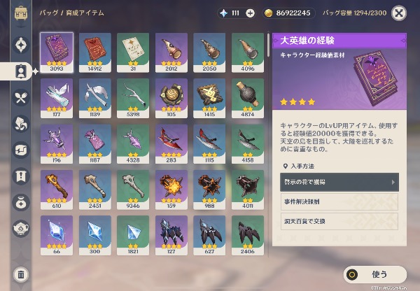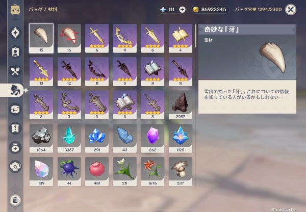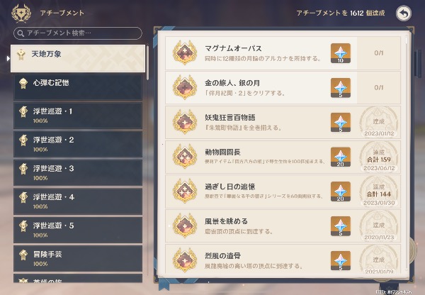 活動日数1871 アチーブ1612 所持キャラ96 全エリア探索済み 所持モラ8千万 原石は100 (紡がれた運命240個)紫経験値本3093個