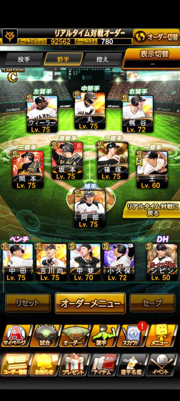 王貞治、阿部慎之助、坂本勇人、広角アーチ岡本和真、シピン、小久保裕紀の野手陣を所持しており