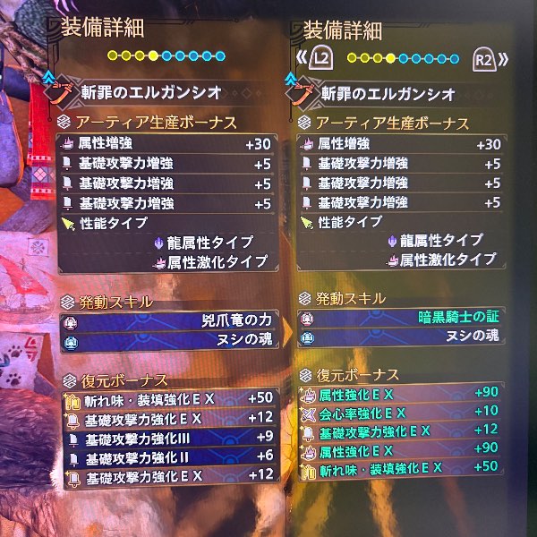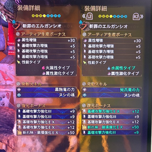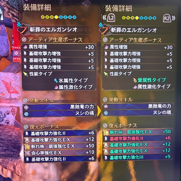 斬罪のエルガンシオ全属性激化全種(基礎攻撃力強化同属性×3)ヌシの魂で揃えてあります。