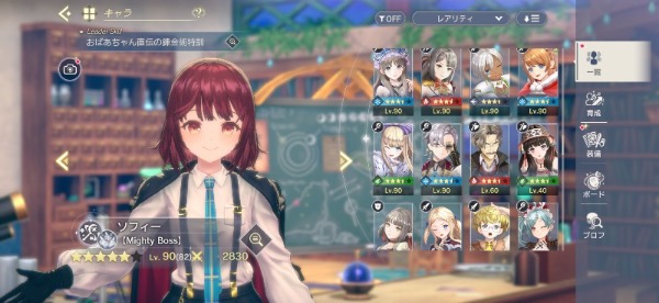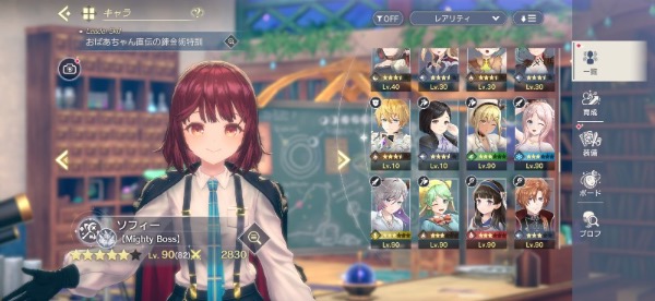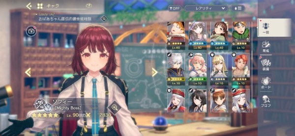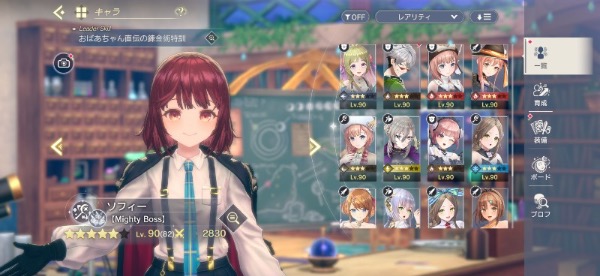 ソフィー(初期、学園)、レスナ(薄着、配布)、プラフタ(ハロウィン)、ライザ(3、ブレイカー、初期)、ユミア、イザナ(アタッカー)、クラウディア(サポーター、3)、フィリス(初期)、ロロナ(初期)、ロゼ(初期)、コルネリア(初期)