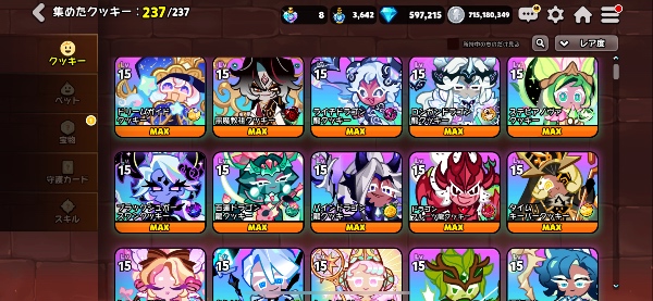 (キシリトールノヴァクッキー以前のレジェンドクッキー5体が飴レベル非MAXですが素材は揃っているため即MAXにできます。)