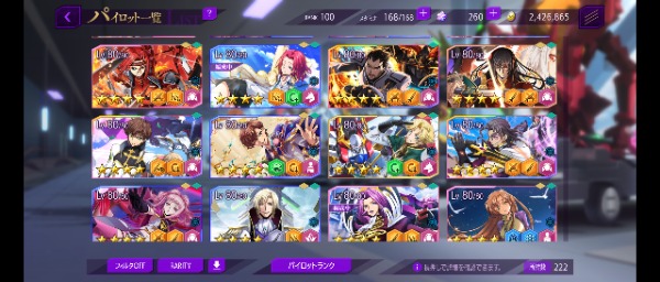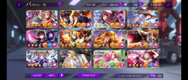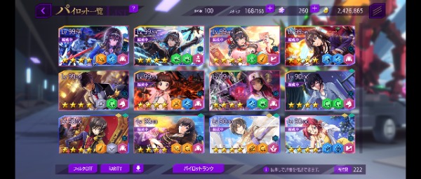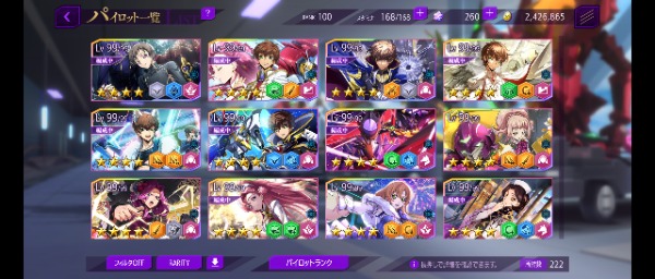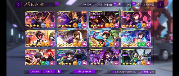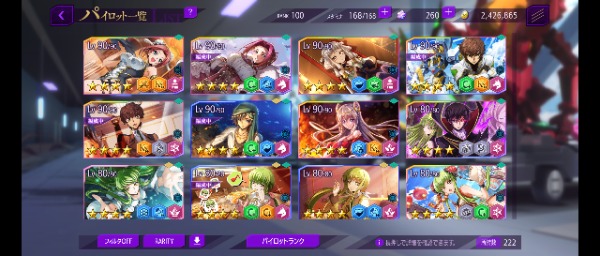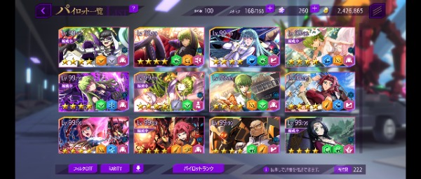 リリース当初からプレイしています 30万円ほど課金 限定星4や強キャラ 強KMF多数(ダモクレスノワール 合体リベリオン ファントムジョーカー 等) 耐久責任CCは1LVです 強化素材は全体兵種2~3体分はあります
