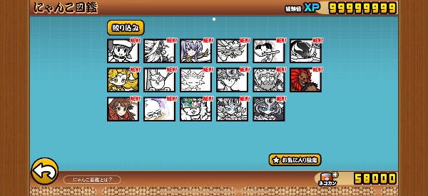 全キャラ所持、猫缶58000、にゃんレアチケ100枚