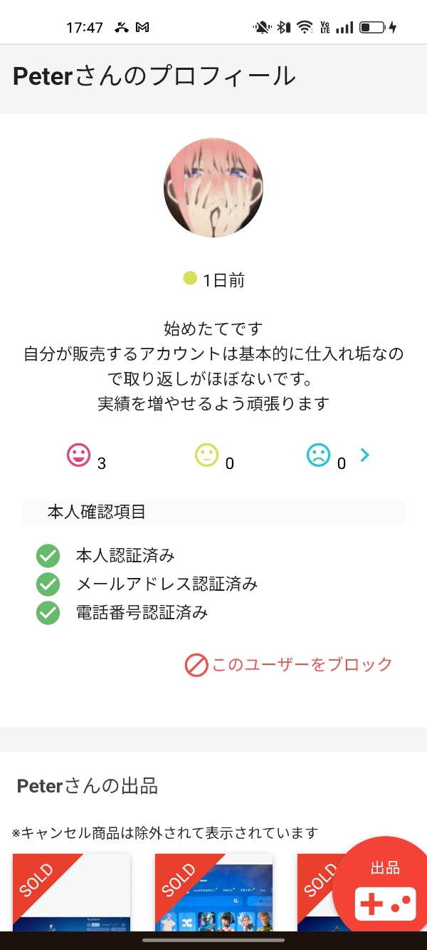 購入する際は相手の評価状況を参考に取引を検討することが可能です。
